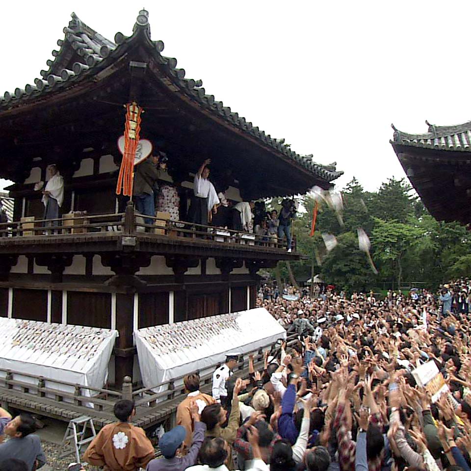 しばらく後には、「うちわまき」でにぎわう、中興の祖・大悲菩薩覚盛(だいひぼさつかくじょう)上人を偲ぶ「中興忌梵網会(ちゅうこうきぼんもうえ)」が行われます。
